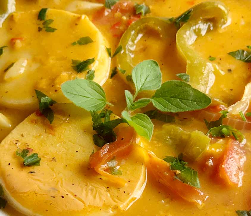 4. Dissolva a maisena no leite de coco. Junte o leite de coco com maisena e a água. Acerte o sal e a pimenta do reino e por último o dendê. Tampe e deixe cozinhar por 20 a 30 minutos, até os legumes estarem cozidos, mas não moles demais.