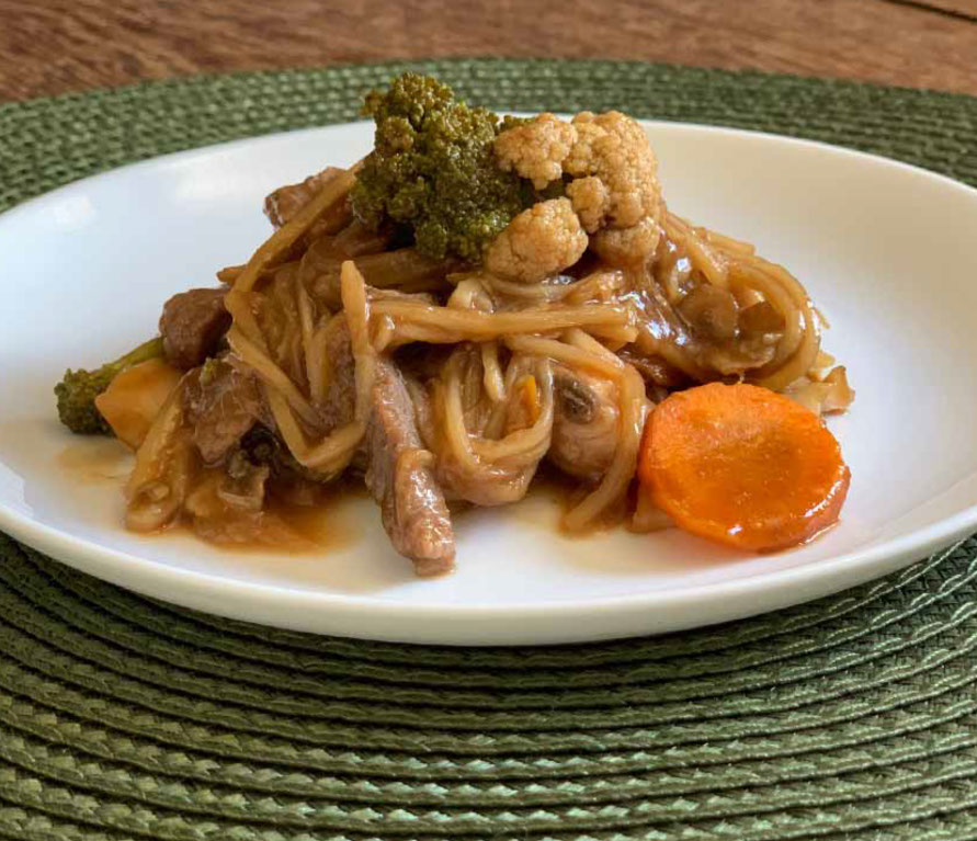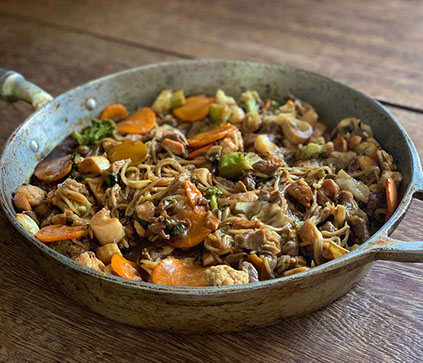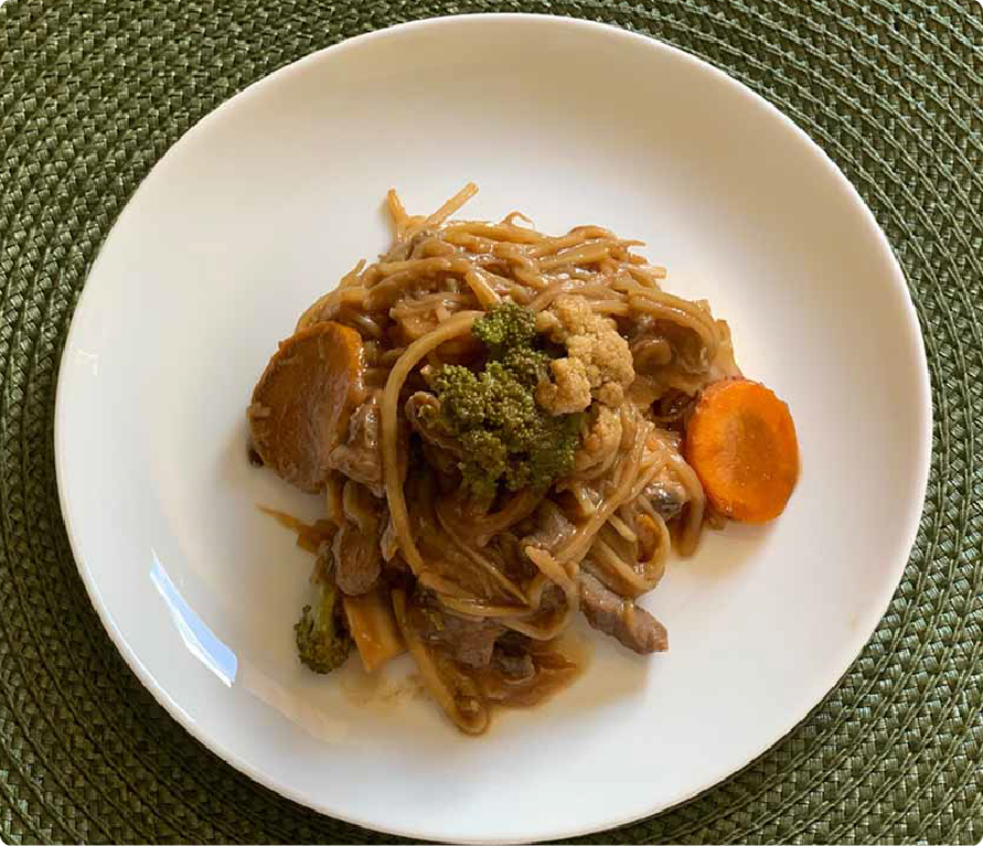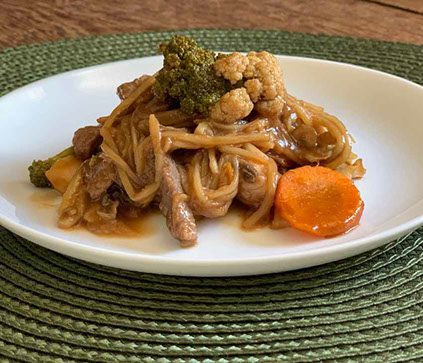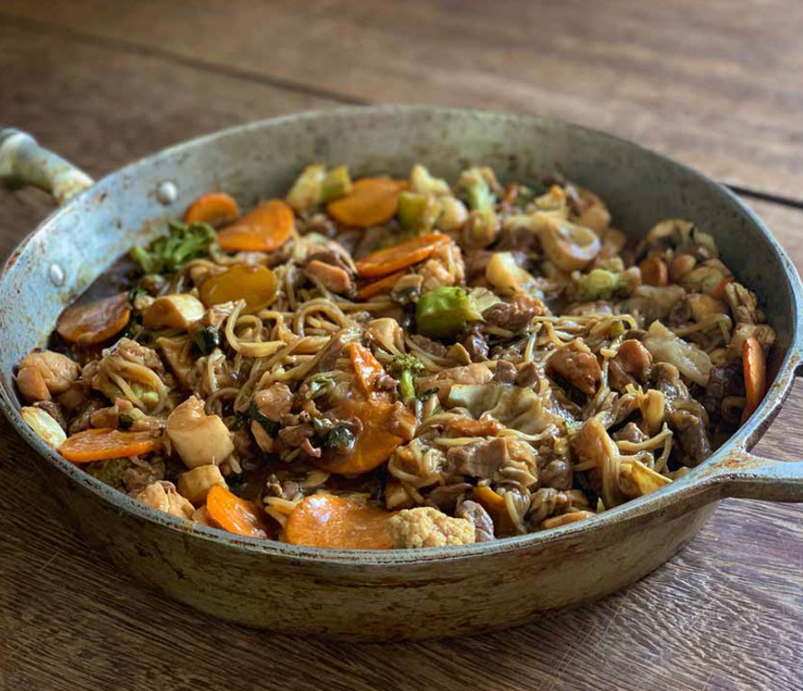 3. Refogue o alho, a cebola e o gengibre, depois acrescente o frango e filet mignon e refogue bem, adicione o shoyo a couve-flor, o brócolis e a cenoura.